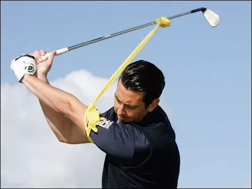 注意两点:保持左肩膀缓慢下杆,绳子不能太紧绷。这样会使你减少错误动作的产生,避免下杆时球杆过快释放。