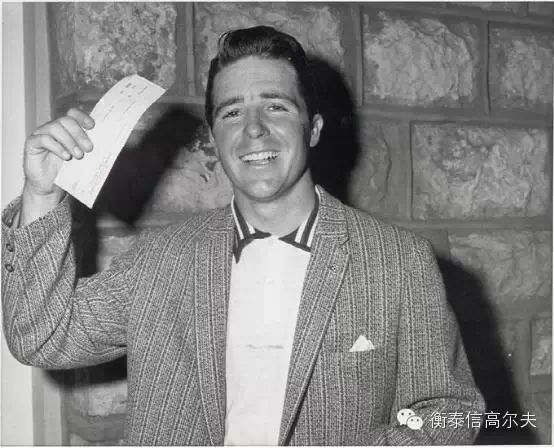 加里-普莱尔,这位九次满贯赛事冠军得主,在上图中看起来相当高兴。1958年在肯德基赛马公开赛上,他赢得了自己的首个PGA巡回赛胜利,手中拿的就是比赛的奖金支票。在辛苦了一年之后,他的收入是18,591美元。而在过去的21天里,霍雪尔每分钟赚445美元。