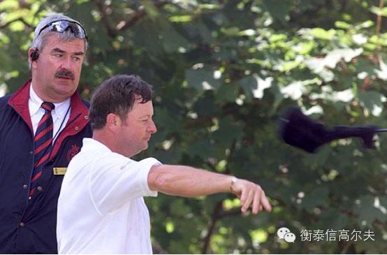 伊恩-伍思南(Ian Woosnam)因球包里球杆多于标准数量遭罚心情不佳,撇出一支三号木。