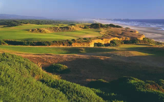 位于太平洋沙丘球场对面的海岸,但截然不同。有人称之为林克斯球场,但是打球时经常受到水侵袭的困扰,而且只有几个果岭可以打较低的滚动近击球,因为百喜草可不是那么容易落地滚动。海洋球场是皮特-戴伊天赋和多才多艺的又一力证。如果有人说在戴伊的呼啸海峡球场和海洋球场发现了共同点,那他绝对在扯谈。