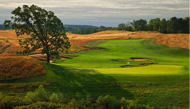 皮特-戴伊将密歇根湖前方两英里长的平地打造成成如今的海峡球场,被称为“美国中西部的圆石滩”,其实它跟爱尔兰的巴里巴宁球场更像近亲。不过海峡球场比他们两者更好的地方在于其par3洞。所有的4个par3洞都挨着密歇根湖,令人印象深刻。