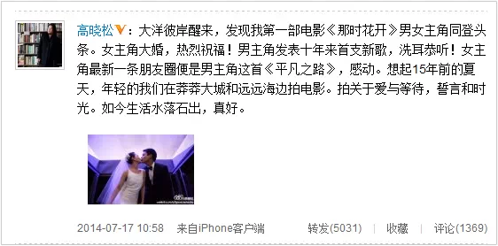 去年7月,周迅大婚,朴树回归,高晓松的一段微博引来无限感慨。而朴树的妻子吴晓敏也表示朴树与周迅一周都有联系,经常见面,这样的朴树只会让她更爱。即使分手也依旧是彼此精神上的密友,这种关系和天长地久相濡以沫一样可贵。