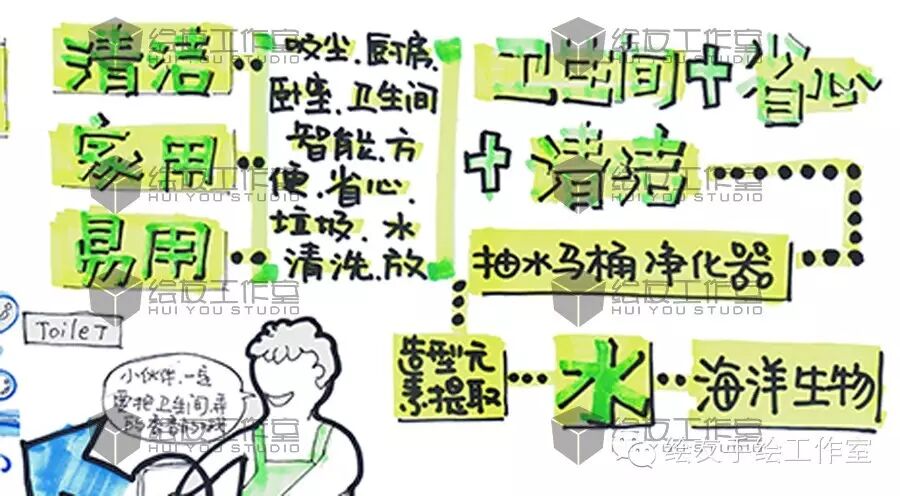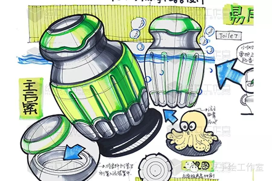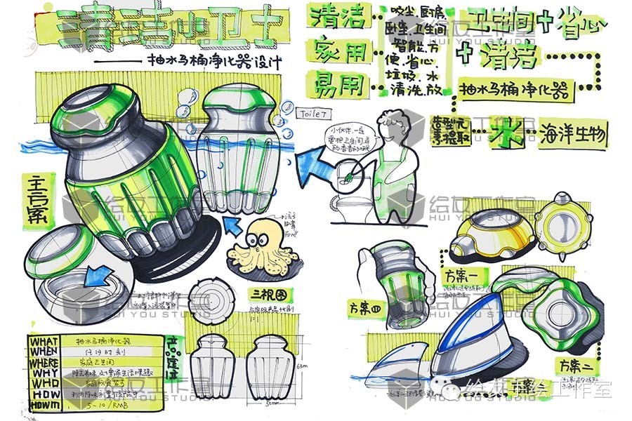 2、设计说明:该快题作品是以“清洁+家用+易用”为出发点,进行发散式思维定题,最终确定为“抽水马桶净化器设计”。然后根据分析现存产品大多造型简洁,缺少趣味性,因此设计一款仿生的马,桶净化器设计,增加生活中的趣味性。因为与水有关,选取生物水的造型更为贴近主题。初选方案和主方案都是选用水生物作为造型来源,整个卷面很统一。