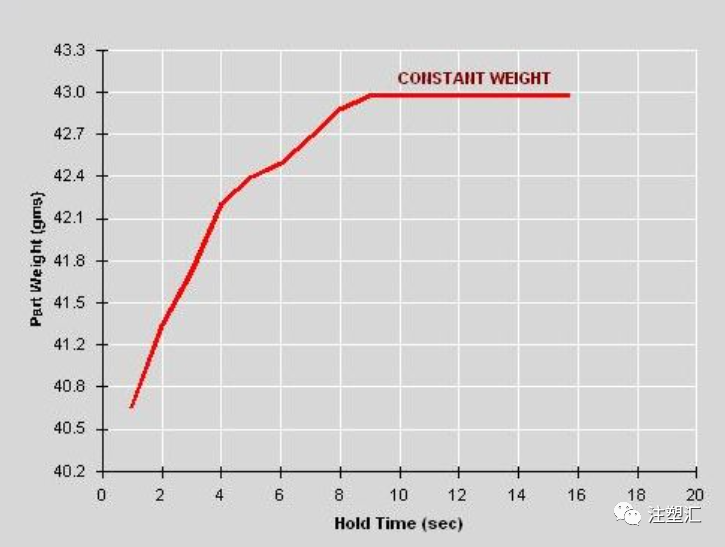 称量不同保压时间的样品称重,随着保持时间的增加,越来越多的塑料进入腔体增加重量。但是,一旦浇口冻结,塑料就不能进入型腔,零件重量保持不变。这被称为浇口冻结时间或浇口封闭时间。见下图: