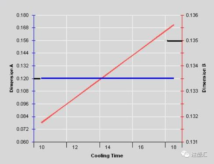 在上图中,尺寸A(蓝色)不受cooing时间范围试验的影响。然而,尺寸B(红色)随着冷却时间的变化而变化。尺寸B的目标值为0.135。所以我们可以在17秒左右设定冷却时间。