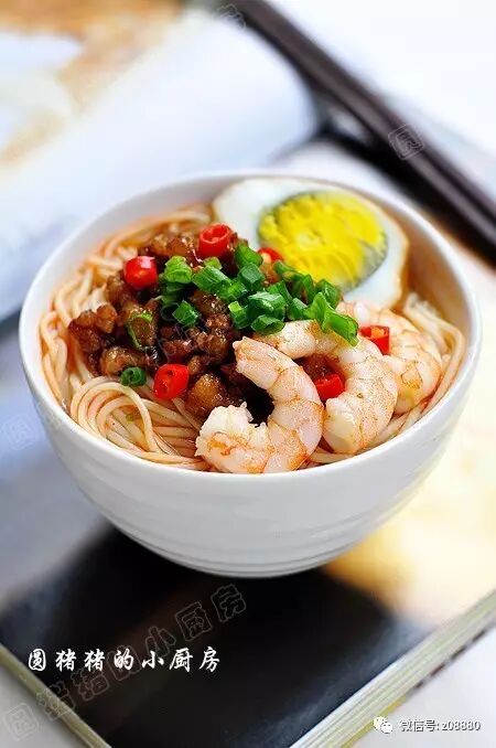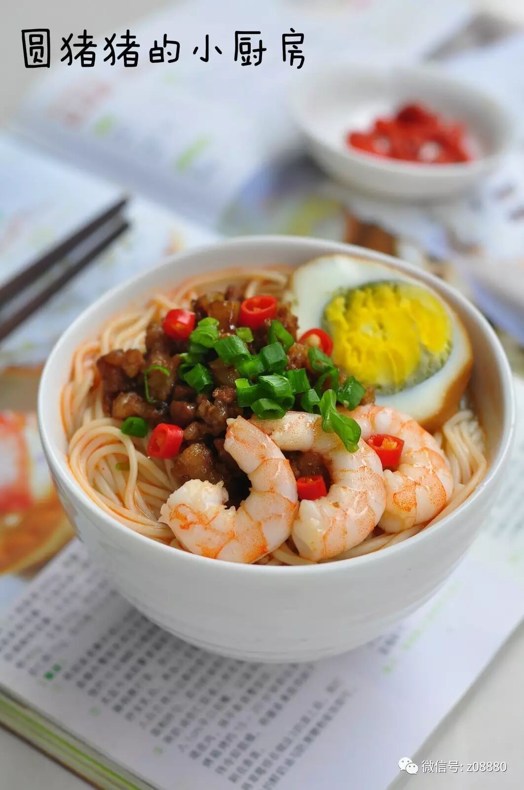 材料:五花猪肉300克、红葱头4个、鲜虾250克、豆芽菜20克、熟鸡蛋2个、面条250克、葱花1小匙