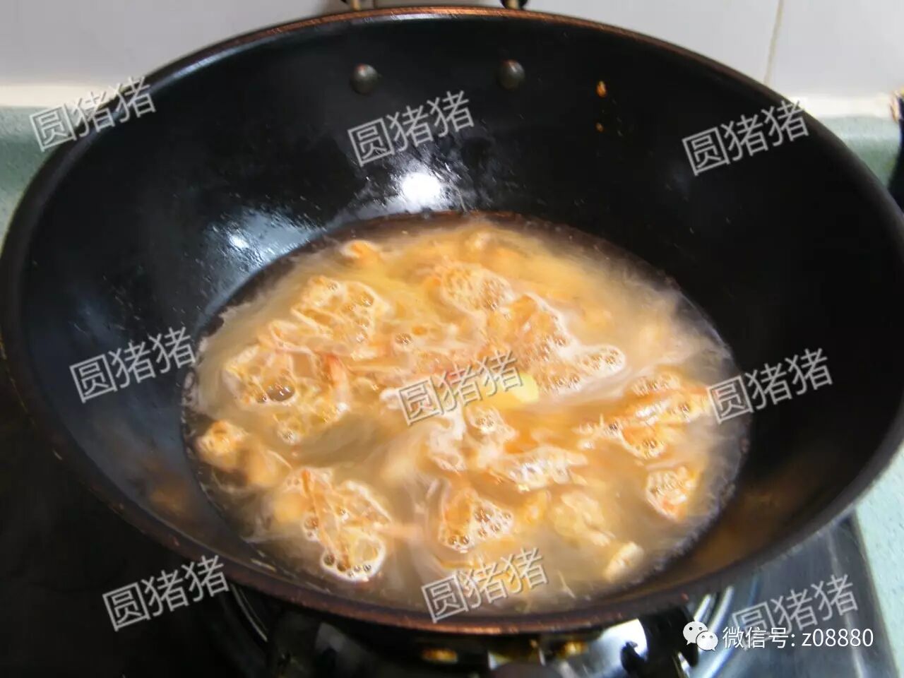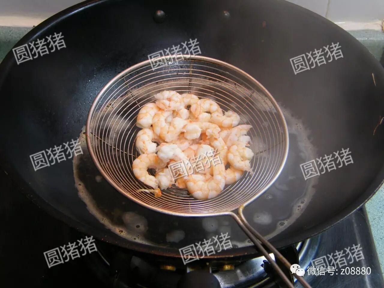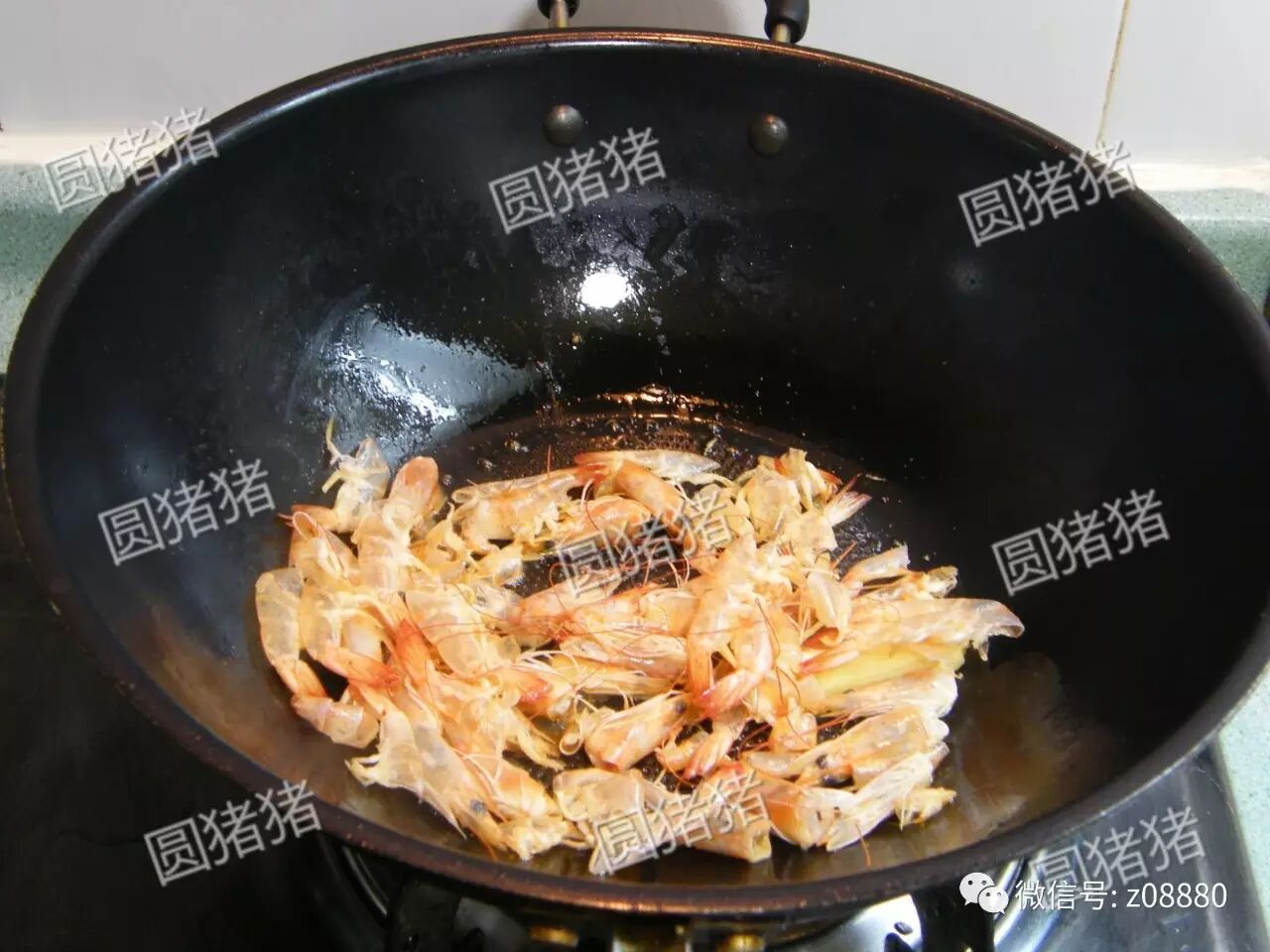 7.锅内1小匙油,冷油放入虾头及虾壳,姜片炒至变色。