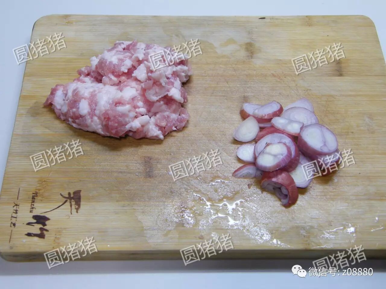 1.猪肉切小丁后粗斩成肉馅,红葱头切片。