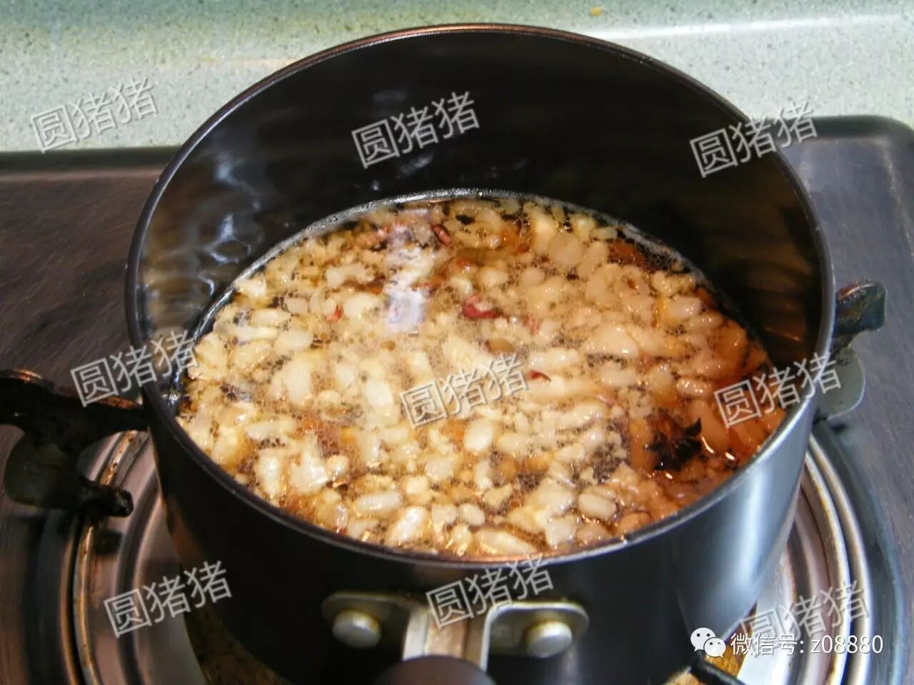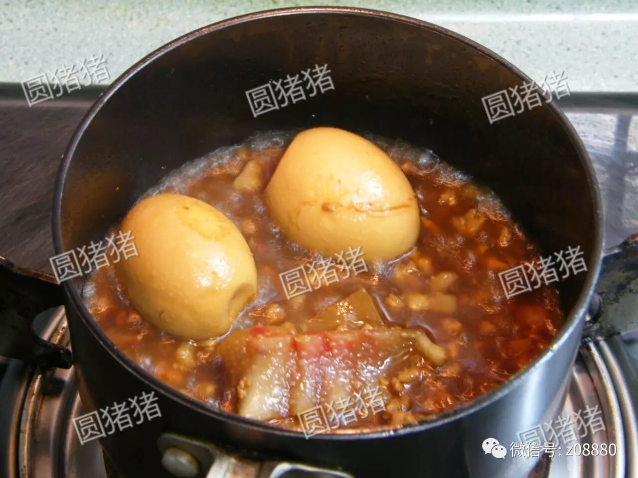 4.将猪肉馅装入小锅内,放入熟鸡蛋及所有调味料,清水250ml。