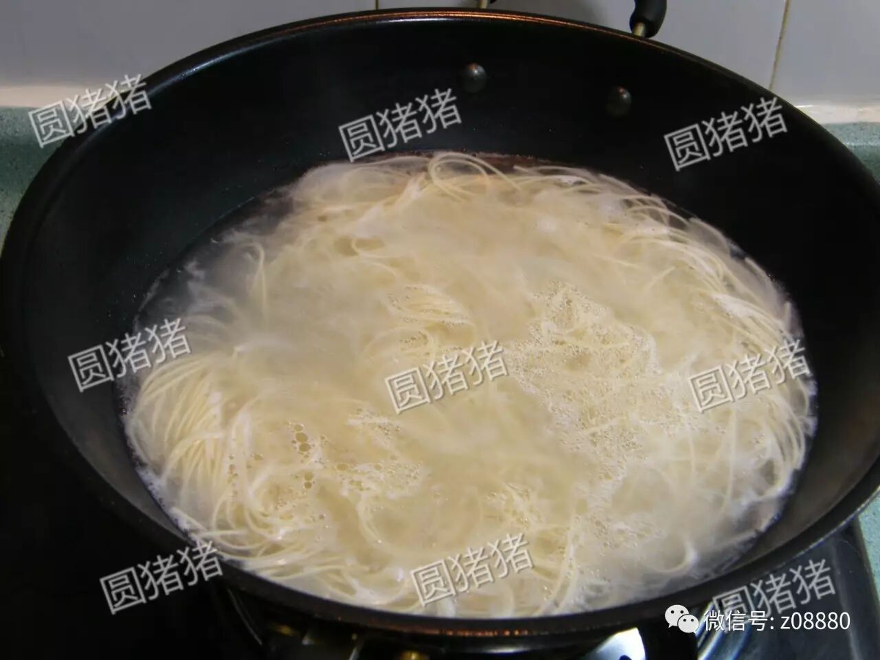 9.锅内放少量盐,烧开水,放入面条,中途加3次冷水煮至熟,捞起备用。