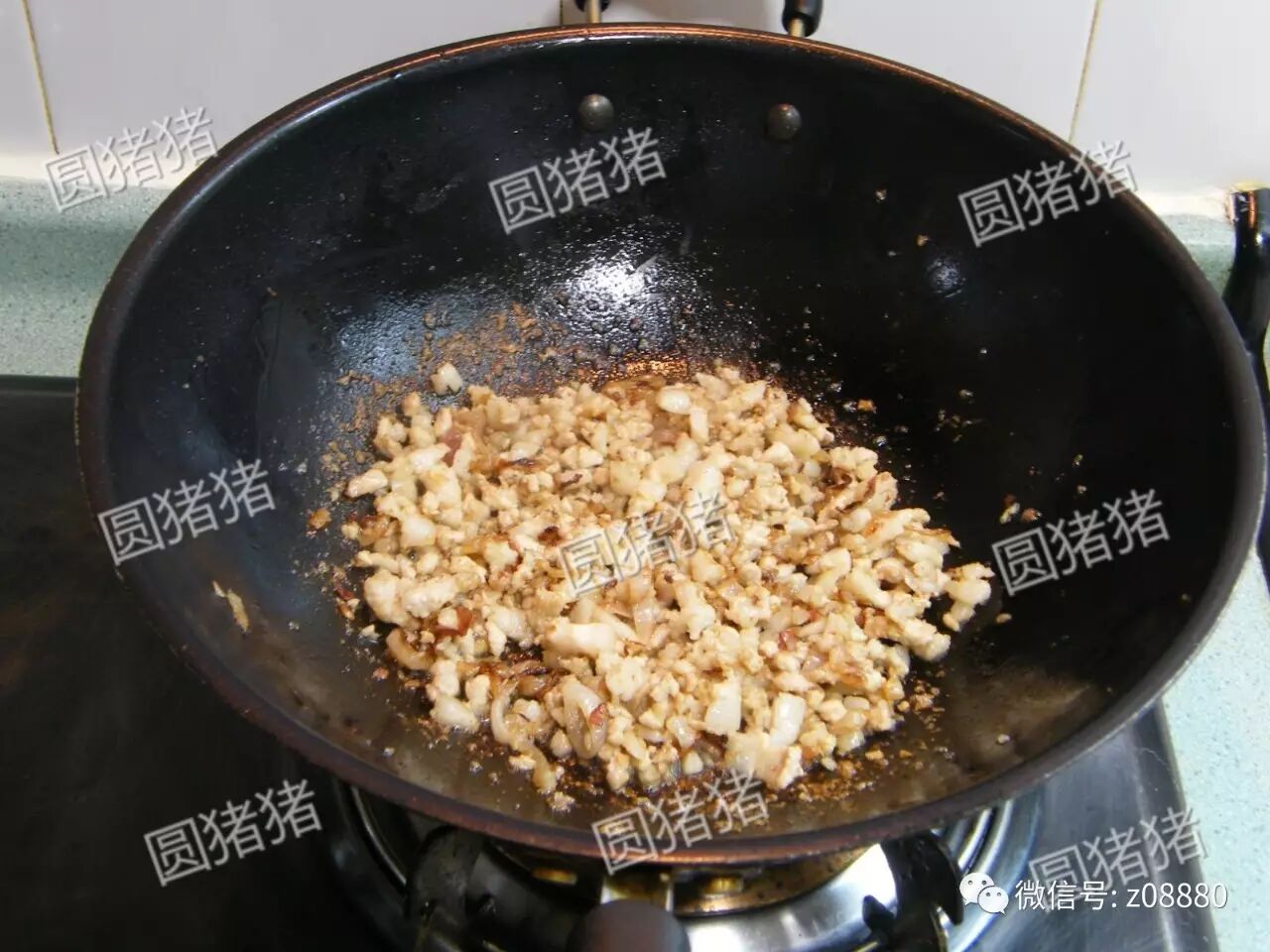 3.加入猪肉馅,小火煸炒约5分钟至出油。
