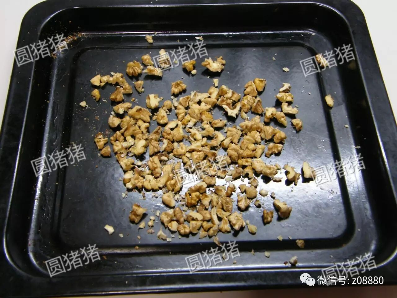 1.核桃仁切碎,放烤箱中层150度烤5分钟,放凉备用。