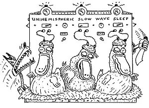 “像是海豚及海豹这类的海洋哺乳类及许多鸟类都能只让一侧大脑休息”。