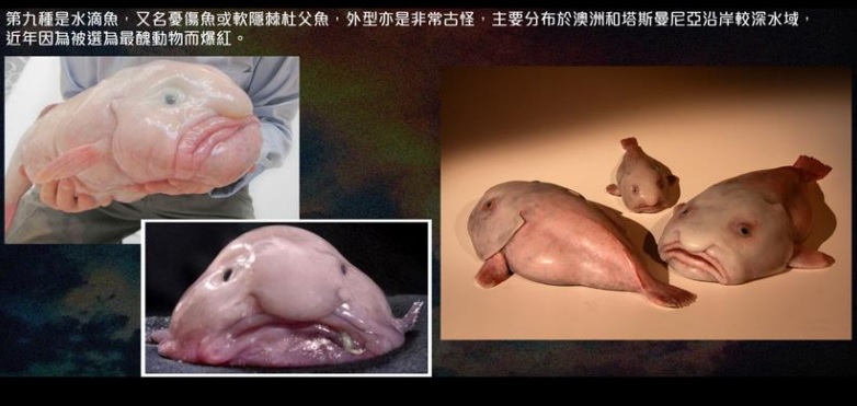 又名忧伤鱼或软隐棘杜父鱼,外型亦是非常古怪,主要分布于澳洲和塔斯曼尼亚沿岸较深水域,近年因为被选为最丑动物而爆红。但你的记忆中,曾否从任何途径见过这么古怪的鱼?相关文章︰Blobfish voted world's ugliest animal