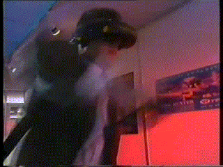 Virtuality是个啥样的机器呢?它的头显看起来更像是个环。人们需要在服务员的帮助下戴上这个又大又重的玩意,然后站在类似于如今的万向跑步机的平台上。游戏开始之后,双眼前出现的是带有简单线条的,延迟将近50ms的立体画面。人们可以通过手柄控制器完成一些拳击之类的简单游戏。你可以通过下面的动图感受一下: