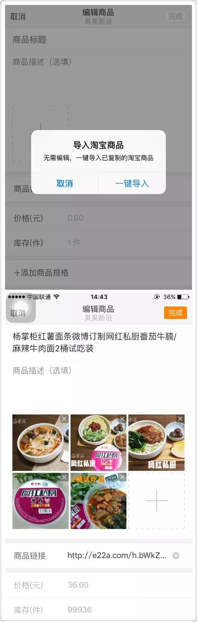 在自己商品过多的情况下,也可以查询自己的商品,便于编辑。商品发布这块其实没有很大的变化,基本与手机端相似。唯一的区别是手机端支持一件导入,当你复制淘宝链接时,打开创建商品,会弹出一键导入,自动导入商品信息,直接点击发布或者编辑就好了,比上之前不断地复制粘贴,在体验路径上还是挺加分的。具体的页面如下: