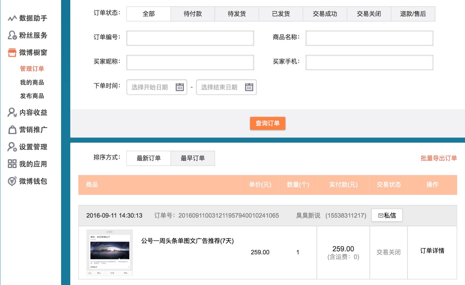 其实就是把原本在手机能操作的事情放在PC操作了,商家商品及编辑商品的时候更方便了。目前在个人的管理中心能看到“微博橱窗”。其实仔细看还是比手机方便太多了,加了一些不起眼的小功能,希望能够给大家带来方便,比如根据订单编号、商品名称、买家昵称及买家手机对订单的查询,批量导出订单等等,都是基于之前的不足改进过来的。目前来看,页面还是挺流畅的。