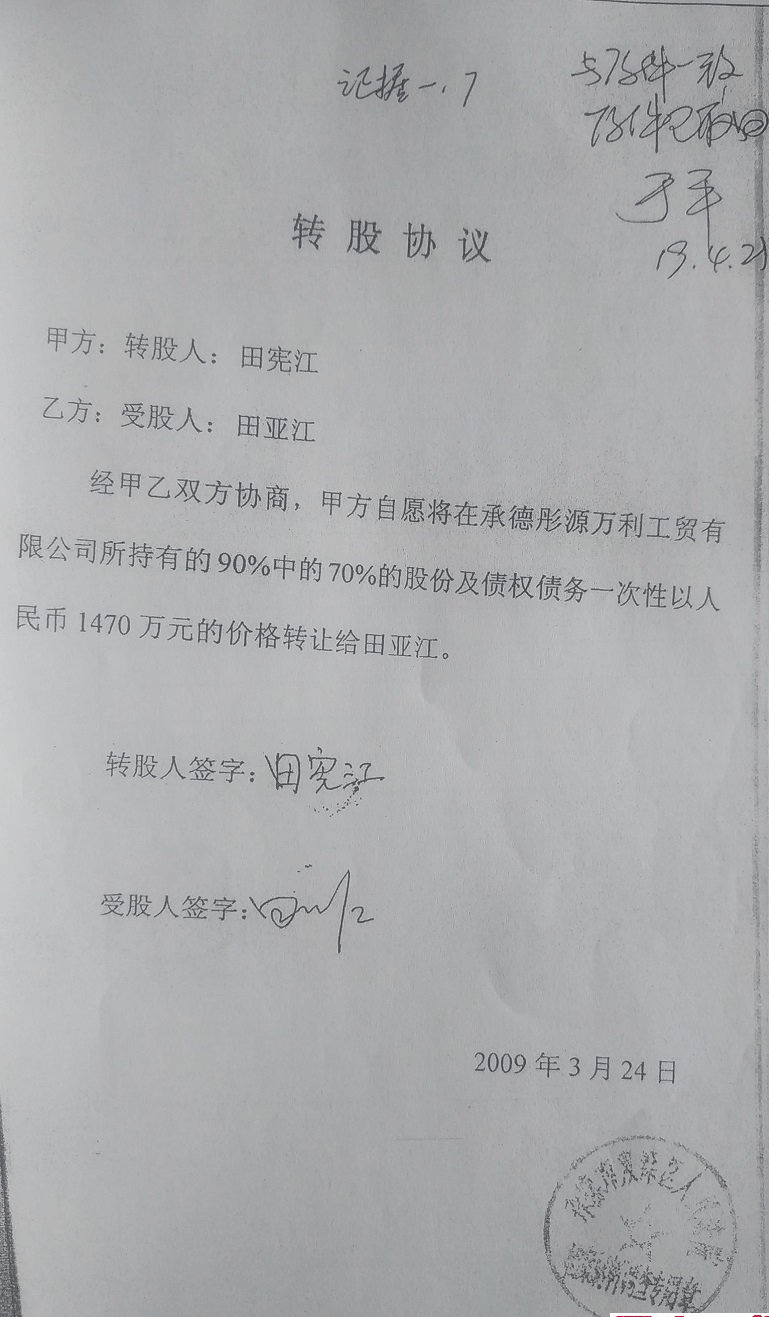 实际上,三份文件中田宪江签名均非本人所签。至此,田亚江持有承德彤源万利工贸有限公司80%的股权,剩余20%股份由其弟弟、妹妹各占10%。第二天即3月25日,在双滦区工商行政管理局办理了股权变更登记手续。而田宪江只在公司负责一些琐碎事务。