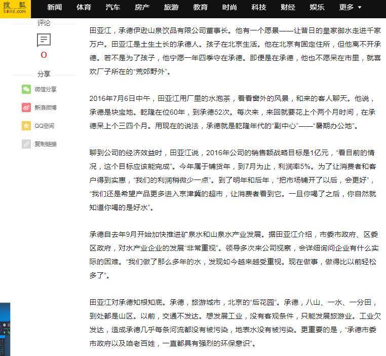 腾讯大燕网2016年8月2日报道的《河北承德将建“矿泉城”》中对田亚江的采访报道