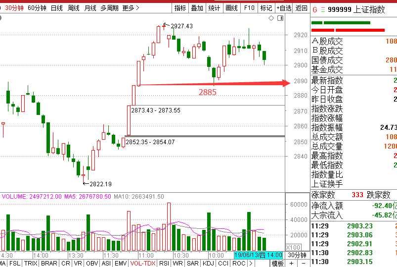 今天早盘15分钟放量、30分钟继续放量但是收阴线十字星,说明市场犹豫不决,并且我一直提醒大家不断有抛盘抛售,截至收盘上证跌幅-0.25,60分钟看第一次破震荡小平台,不排除下午第一个小时继续延续跌势,30分钟K线是中继形态,唯独心安的是15分钟回踩2903均价线支撑收盘前反弹,但是这个级别比较小,注意预防下午尾盘跳水,仓位控制不要超过3成,5成仓的要计划好破位止损的位置。不排除回调到2885支撑的可能,但是这样个股回调很猛,风险规避。