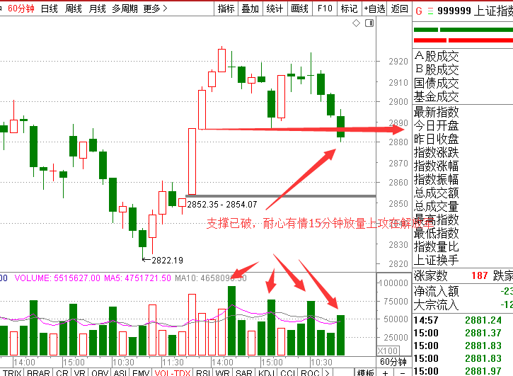 周五受外围消息油轮袭击影响,指数高开低走,沪指跌逾1%,创业板指跌逾1.8%,深证成指跌逾1.5%。今天早盘15分钟放量、30分钟继续放量但是收阴线十字星,说明市场犹豫不决,并且我一直提醒大家不断有抛盘抛售,上午收盘上证跌幅-0.25,60分钟看第一次破震荡小平台,预测下午第一个小时继续延续跌势,没想到接下来两个60分钟全部跌势,提醒会调到2885支撑的可能,但是实际上打破了2885的支撑,收于2881,日线很难看,下周有低点是肯定的了,但是周线收阳,把上周阴线吃掉一半以上,举例收月线还有两周时间,所以反弹回调个股机会还是有的。