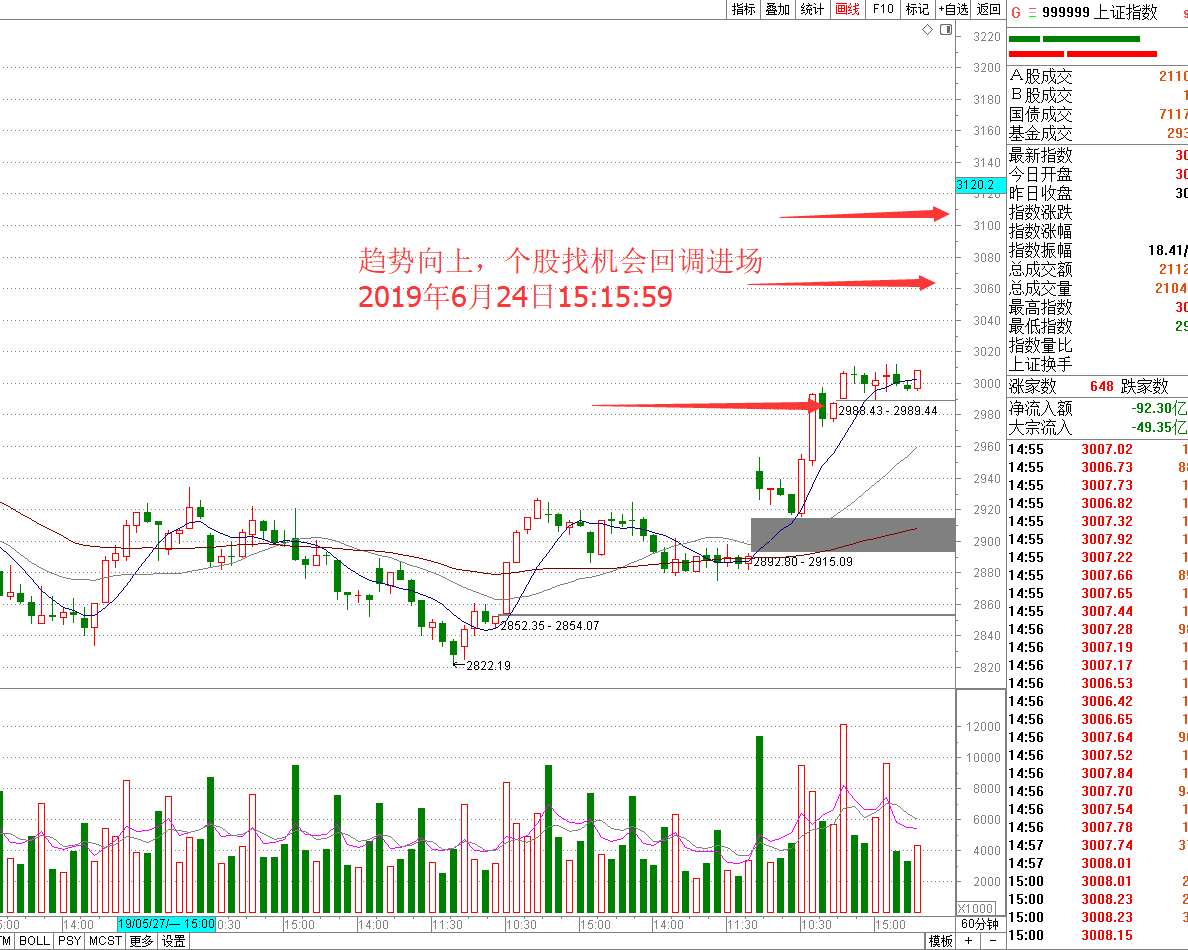 观点:突破后上方的第一压力是在3052,第二压力在3148.所以现在所有的震荡没有跌破60分钟放量阳线低点都是回调,不要恐慌,按照计划进场。