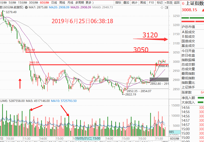 后市观点:突破后上方的第一压力是在3052,第二压力在3120.所以现在所有的震荡没有跌破60分钟放量阳线低点都是回调,不要恐慌,按照计划进场。