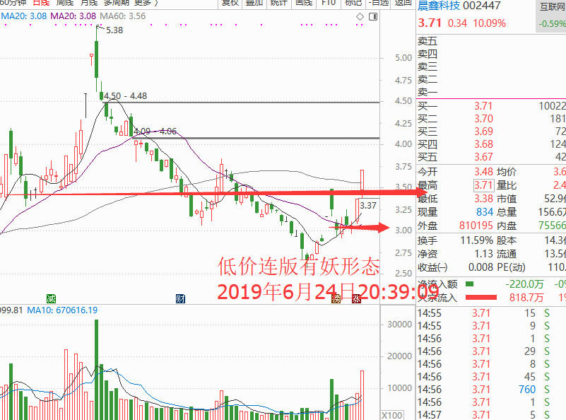 大盘这个位置思路个股参与的要转方向了,稍微转向连扳有可能走妖的个股,趋势向上多出妖,特别是二连板站上大趋势线的,周一复盘看到晨鑫科技002447,前一波上涨后上周打板深回调洗盘,然后今天再次打板突破假阴线真阳线的成交量(6.17日高点),说明主力意图明显。虽然距离前高压力比较近,但是不改主力向上做多的意愿(就是不愿再回调给低位卖掉筹码的人进场的机会,主题上就是区块链相关也是当前热点,所以可以重点关注,注意控制仓位和节奏,趋势线20均线是止损点: