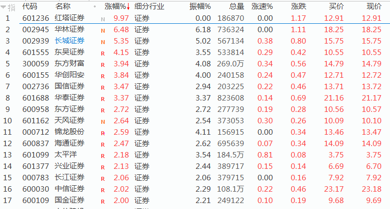 其中红塔证券封涨停,华林证券、长城证券涨超4%,东方财富、华创阳安、华泰证券、天风证券、哈投股份等多股跟涨。