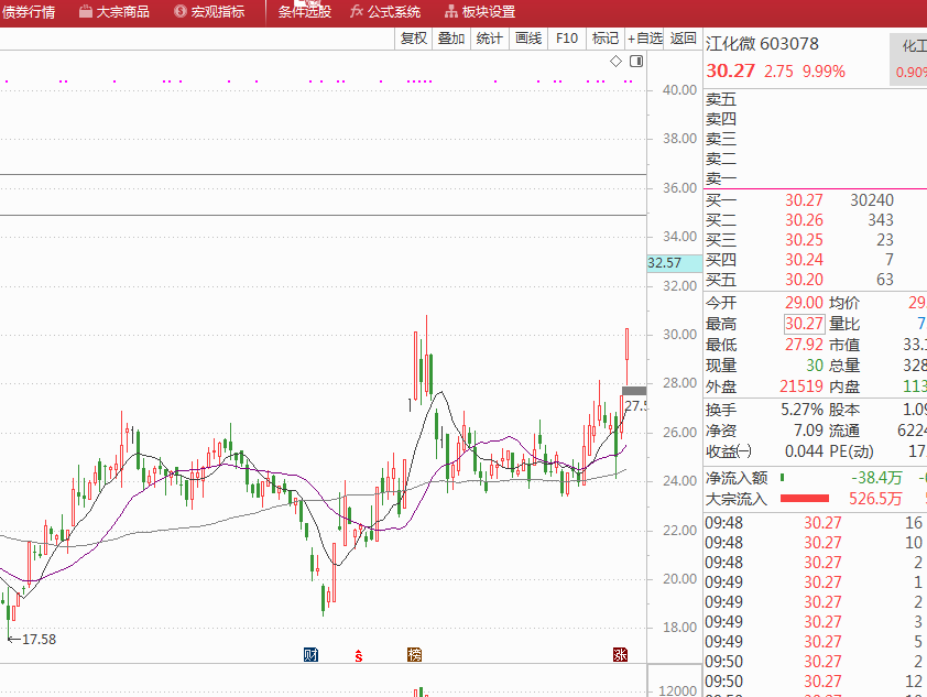 早盘重点关注的603078江化微再次封板,能否走妖持目以待,不过这个票早盘进场机会还是给了,就看有没有提起挂单。