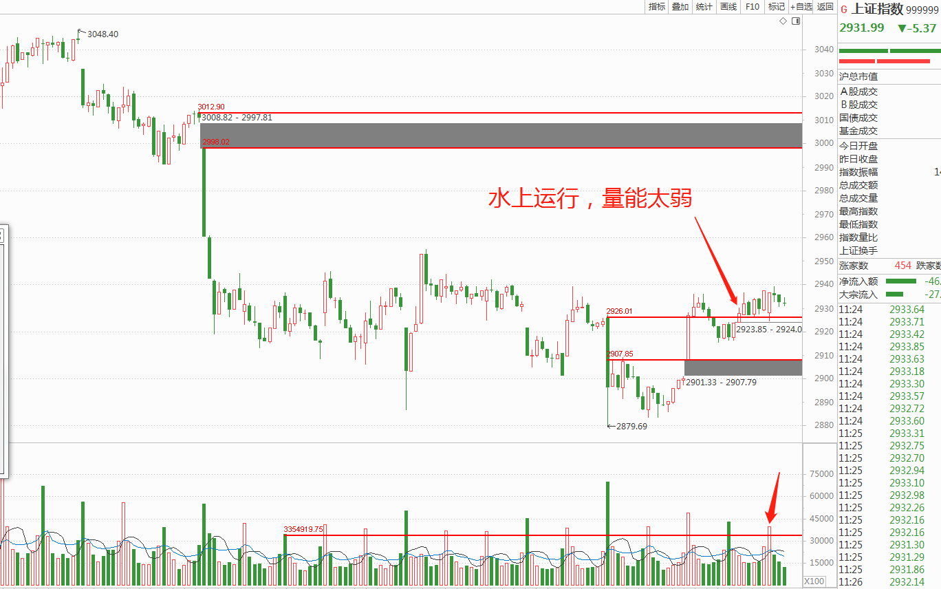 早盘三大股指集合竞价小幅低开,其中沪指低开跌0.32%,然后15分钟快速反击,最终15分钟收盘收假阳真阴线,从盘面上看,电子消费和零售等板块涨幅居前;黄金、ETC和化工等板块跌幅居前。依旧是无量反弹,不过现在是在水上,个股的机会不太明显。
