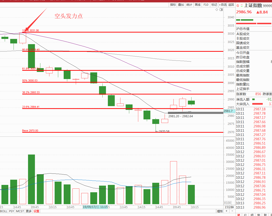 技术派都知道两根阳线定趋势,但是明显15分钟第三个收的成交量小于前面的成交量,这个点位是昨天下跌的0.382,如果反弹到这里就回调的话那可就是弱势反弹,强势不要破前底,真正的均线压制点位还没有到就怂了吗?最少冲一下2995吧(20均线压制位。)