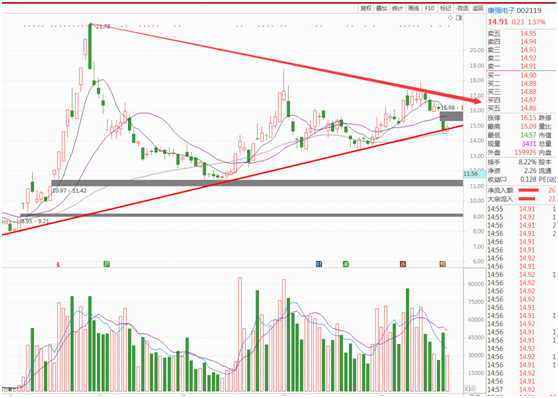 个股机会:大盘盘整个股回调,没有板块龙头的情况下只能从前期强势的里面做筛选,原则依旧是业绩为王,技术图形配合,板块依旧是电子、通信、5G等科技概念为主,复盘找到前期的002119康强电子,业绩历年稳增,昨日收阳在60均线上方,成交量虽然没有盘整缩量,说明这里多空意见分歧严重,可以适当关注,如图: