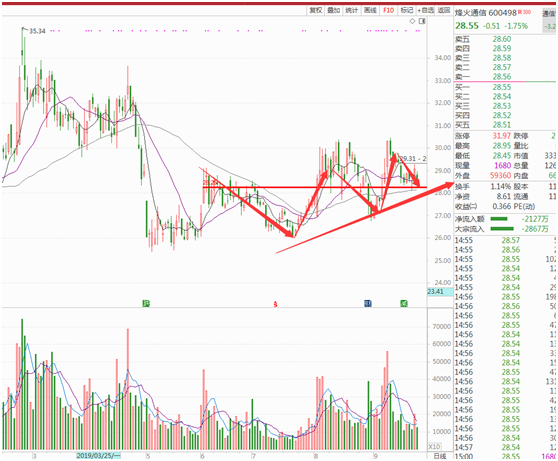 虽说高通放开对华为的供应,但是5G概念依旧是我们的主线不变,前期涨幅过高的不追,技术走坏的不参与,复盘查到600498烽火通信是一家生产光纤通信和相关通信技术、信息技术领域科技开发;通讯线缆及附件、 海底光缆、海底电缆及海底通信设备的设计、制造与销售,业绩属于慢涨性的,目前股价出于近三年的边际,技术图形三重底,且前期有打板启动的吸筹动作,中线可以重点关注。如图: