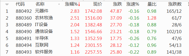 早盘盘面创业板指高开高走,拉升涨逾1.6%。消费电子再度走强,歌尔股份、联创光电、凯盛科技等纷纷涨停。稍强于主板。科技股今天集体反攻,涨幅居前的板块元器件、农林牧渔、IT设备、通信设备、半导体、互联网等,昨天跌势最猛的今天反弹越凶。