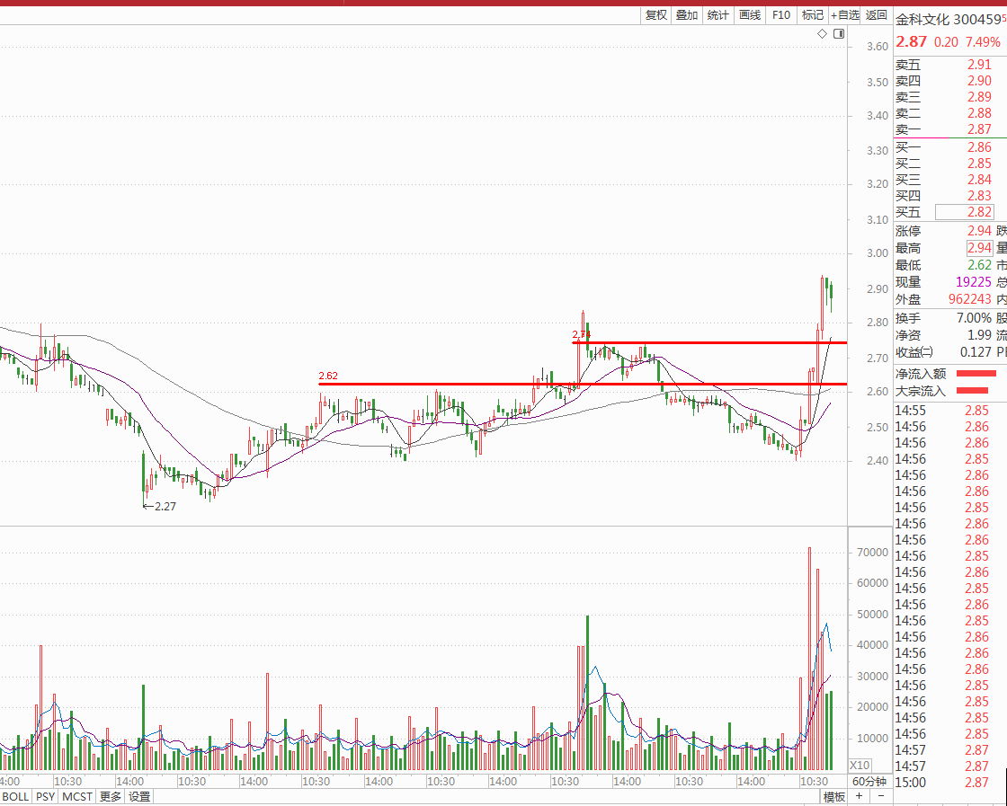大A上市公司的上涨多数是资金追捧性质,在以业绩为参考的情况下重点配合技术图形、成交量上攻与否代表资金介入的力度解读很有必要,节前最后一个交易日就出现这样一家公司,300459金科文化,仅仅当天成交额已经达到4.46亿,属于明显的量增价涨趋势转折点,可重点关注,最后支撑 第一位置2.75、第二支撑2.65,这都是主流资金持续进场的重点位置,可以以此作为市场中短期止损点。