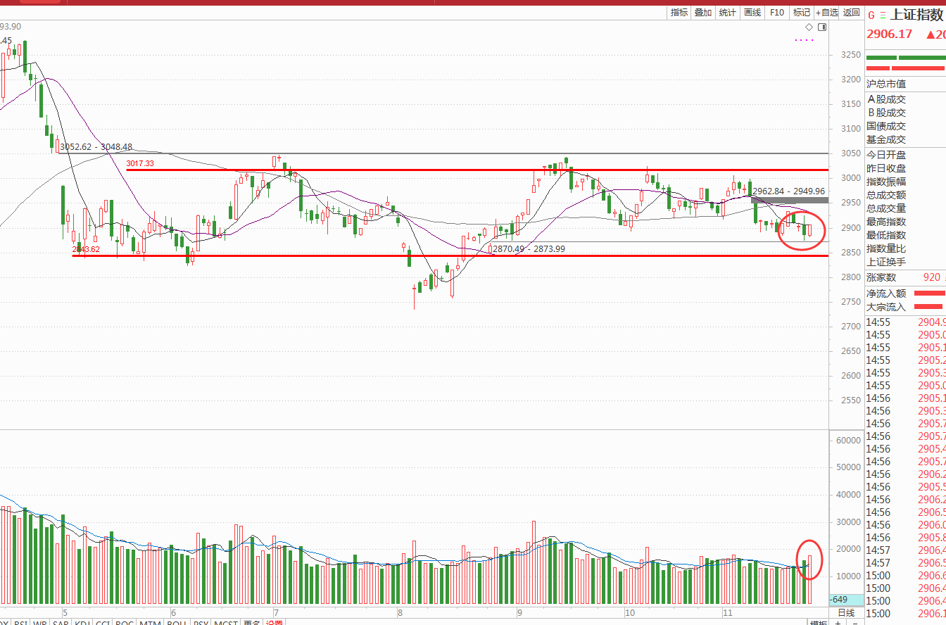 事实上盘整快速上攻实体收盘站上了2900上方,30分钟成家量达到了533亿,这个数据多头是可信的,最起码没有出现200亿以上的放量回调说明多头今天占主导,下午盘面虽然震荡回调但是对于整个市场走势没有太大影响,而且确定了反转信号。