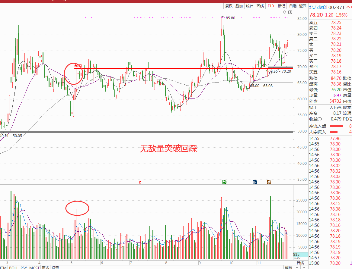 在以科技兴国的前提下不可能期待贵州茅台涨到几万亿的市值,场外资金的观望态度,是牛市无法发动的真正逻辑,之前文章有说过,我只能认可在科技股带动下有一波科技牛市,让场外资金看到几倍的超额收益才能真正有效的刺激行情爆发。周末复盘北方华创002371进入法眼,业绩连续四年稳增,技术上今年上了个台阶之后一直震荡盘整做出多重底的形态,对前方无敌量突破后进行回踩,目前处于多头排列,可重点关注,如图: