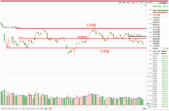 单纯从技术上讲目前处于日线级别夹板下沿震荡,支撑就是夹板下沿,总体来说弱势,为什么?因为夹板上下区间有中轴线,我的研判策略是震荡区间中轴线下沿称为水下,上方为水上,水上做多动能强于水下,反之空头较强。这样的情况下控制仓位是最好的对应措施。如图: