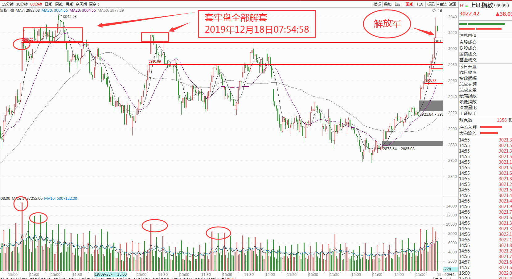 首先不要去猜测高点低点,只找自己那个标志的支撑点,涨势找支撑,跌势找压力,只要不反向突破就不要去理会指标,指标背离了可以再背离,突破了可以再突破。60、30分钟昨天突破了前期套牢盘的点位就是3008点,所以在这个点位上方盘整是最健康的,既然解放套牢盘说明大资金有更高的目标,一旦跌破那就代表大资金自己也跑路了,这个必须逻辑认可,不然做不到知行合一。如图: