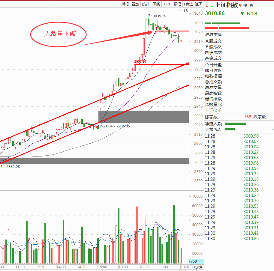 最重要的是技术上,昨天693亿被下破之后已经提醒减仓,今天个股回调到均线位置没有破无敌量依旧是低吸的机会,只是要提防周五依旧惯性回调的伤害。3012点盘中实体破位,深回调也上了轨道,如图: