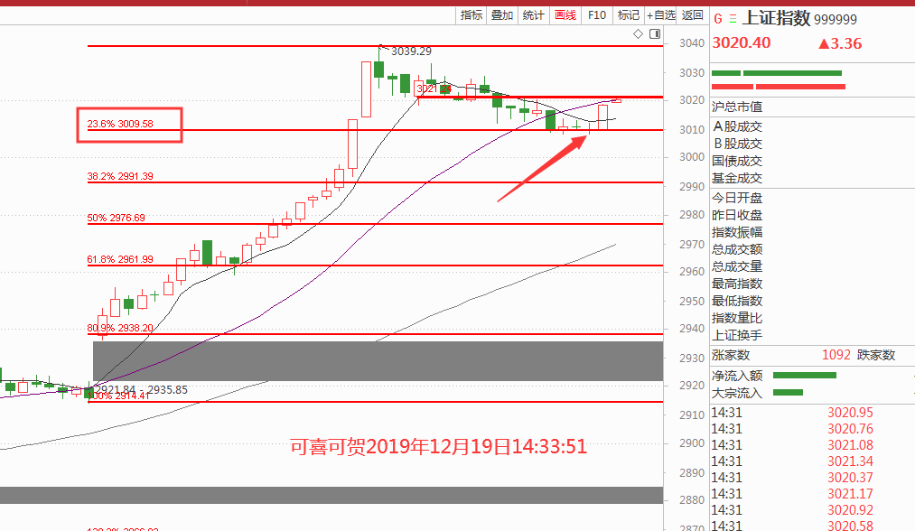 技术上昨天693亿被下破之后已经提醒减仓,今天个股回调到均线位置没有破无敌量依旧是低吸的机会,只是要提防周五依旧惯性回调的伤害。3012点盘中实体破位,深回调也上了轨道,按照黄金分割点回调大盘从跳空上涨低点到高点后刚刚打到0.236位置,属于强势高位盘整形态,如图: