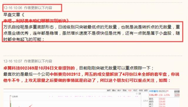 本周筛选个股总体表现不错,其中最得意的当属12月16日文章《来吧,利好袭来咱们聊聊深圳板块》提出重点关注的万讯自控300112,最初选出的时候其实没有预判到会有如此强劲的上攻,纯属意外。如图:
