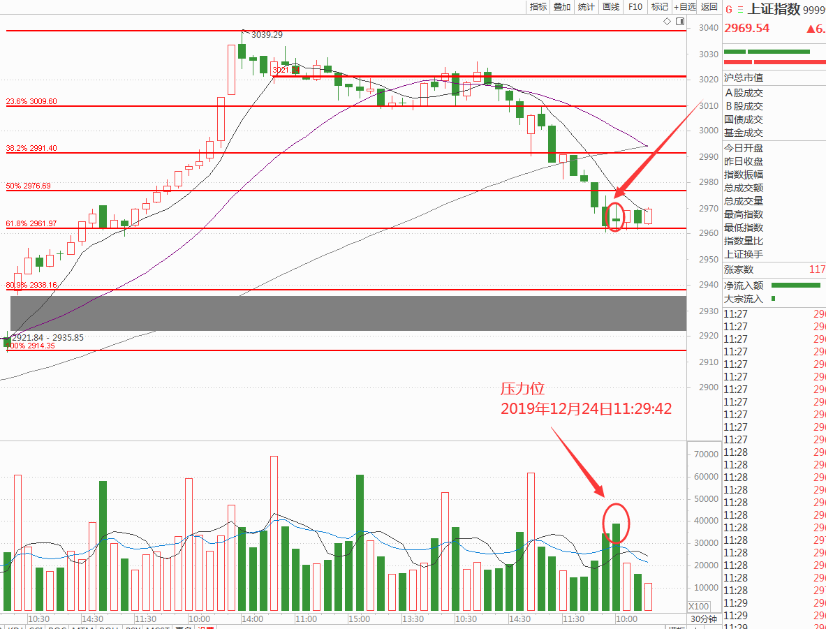早盘小幅跳高,意义不大,下跌回调的趋势不会一下子转换,耐心的等,昨天大阴线之后今天依旧不会很快筑底,紧盯15分钟早盘变化,早盘成交241亿,30分钟收盘425亿的阴线量注定盘中还有新低,这样的技术形态属于行云流水的空头收上影线阴线-----主空,今天依旧是管住手观望。并且在30分钟收盘线给出了小周期压力位给出了新的点位就是今天高点:2972点。