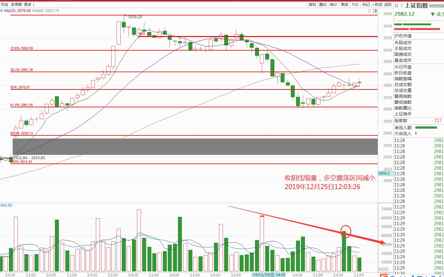 早盘15分钟成交量虽然是收阴线但是成家量明显小了很多,这里表面看空的资金减弱,但是做多的情绪并不大,接下来的15分钟收线证明了这点,多空博弈的区间收窄,预判今天震荡收十字星概率加大。如图: