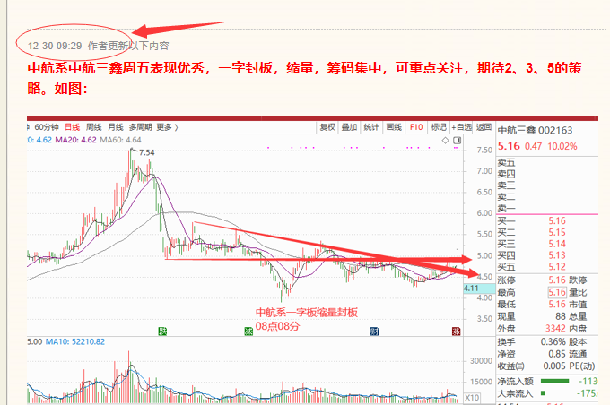 中航系中航三鑫周五表现优秀,一字封板,缩量,筹码集中,可重点关注,期待2、3、5的策略。如图: