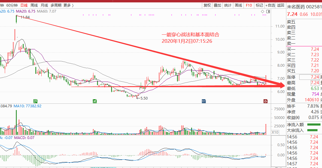 周五市场地产和医药行业上涨打板的很多,业绩相当部分是负增长的,未名医药002581业绩同比增长258%,属于相对优秀,股价处于低价,流通盘4亿,有可能成为资金追捧的目标,技术图形一箭穿心,可以重点关注,如图: