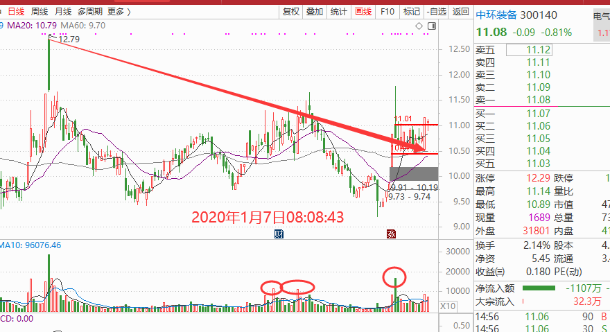 电气设备和环保概念的300140中环装备无敌量站上分水岭上方,一箭穿心也符合,业绩同比增长百分之二百以上,可以重点关注,如图:
