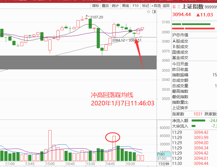 早上盘面按照预期上攻,但是成交量只有四百多亿,相对于前面两天的量能有所减少,所以早盘给的观点是谨防冲高回落的动作,盘中最高冲到昨天高点位置3099点附近遇阻快速回调,盘中创了日内新低,但是无论涨跌成交量在盘中都没有太大增长,这样的话依旧会维持早盘的观点,震荡偏多为主,如图: