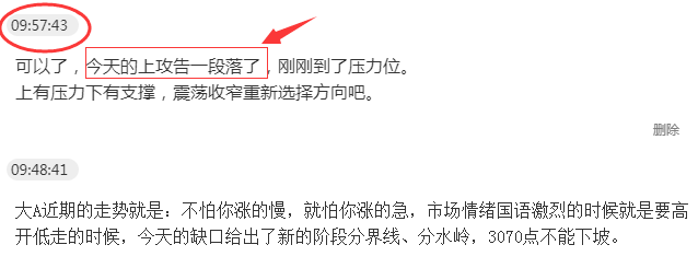 大A近期的走势就是:不怕你涨的慢,就怕你涨的急,市场情绪国语激烈的时候就是要高开低走的时候,今天的缺口给出了新的阶段分界线、分水岭,3070点不能下坡。就在一片上涨的欢呼中时间到了9:57分,我看到这是很好小级别15分钟上涨无量,也到了压力位,所以提醒,今天上涨告一段落,结果那个点位就是今天上午的高点了,如图: